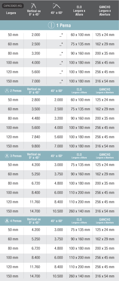 A Leg Branca é uma cinta que possui uma, duas, três ou quatro pernas. Confeccionada com material de alta resistência, possui fator de segurança 4 vezes maior que sua capacidade de uso. Destaca-se por possuir ganchos com trava de segurança em suas extremidades, que podem ser gancho olhal (padrão) ou gancho automático (opcional) para que seja conectada carga.